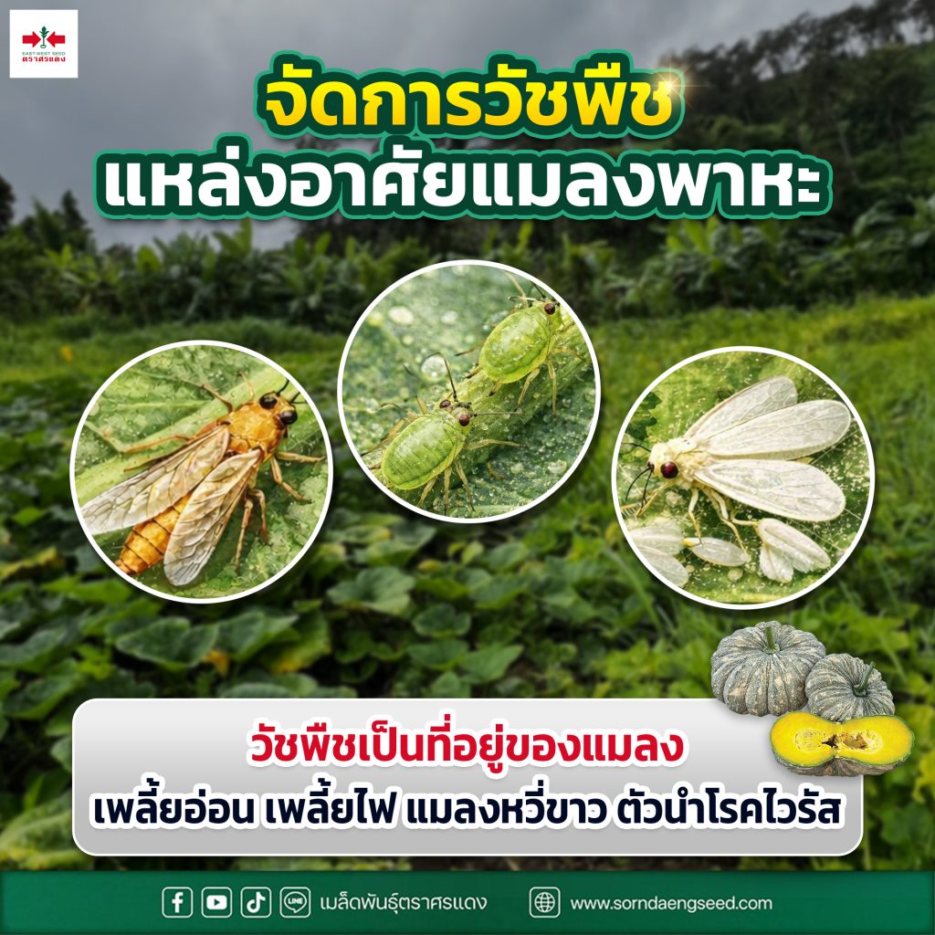 ⭕จัดการวัชพืชเพราะเป็นแหล่งอาศัยของแมลงพาหะต่างๆ ไม่ว่าจะเป็น เพลี้ยอ่อน เพลี้ยไฟ แมลงหวี่ขาว ซึ่งเป็นตัวร้ายในวงการ ตัวนำโรคไวรัส วัชพืชเป็นแหล่งหลบซ่อนของแมลงศัตรูพืชและแย่งธาตุอาหารจากต้นฟักทอง ทำให้การพ่นสารเคมีป้องกันไม่มีประสิทธิภาพอีกด้วย